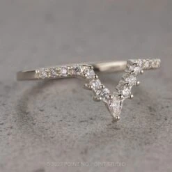 This timeless and unique wedding ring features a striking natural GHSI pear shaped diamond at the center of the v-shaped contour. The pear diamond is accented by sparkly white faceted diamonds completing the contour. Followed by four GHSI white diamonds down each side of the rings band.Â