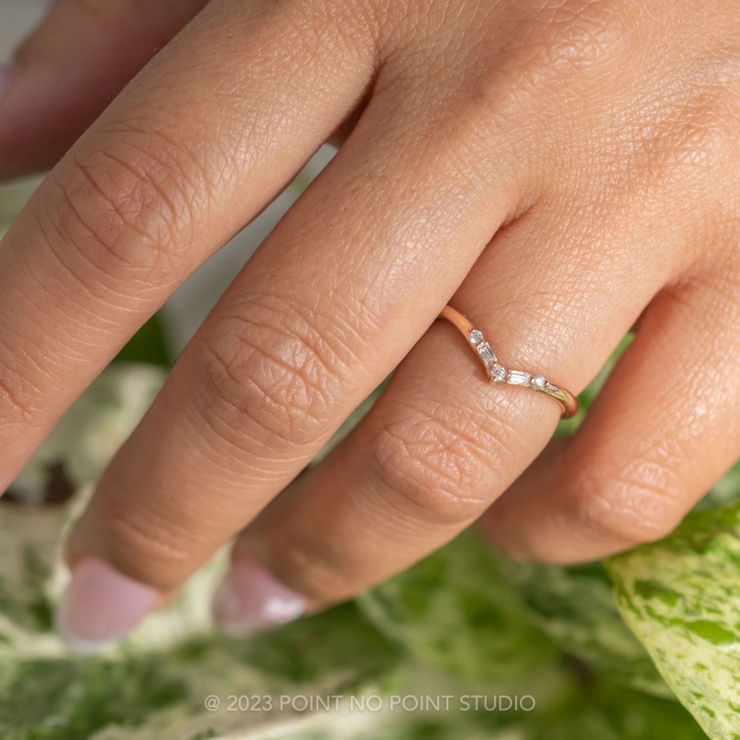 The V contour is formed by striking white baguette diamonds accented by natural GHSI brilliant cut diamonds. The entire ring is made of recycled 14k rose gold.Â