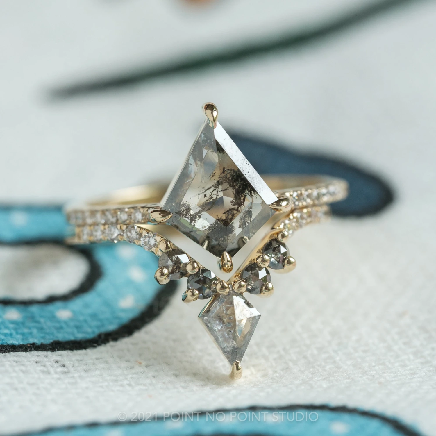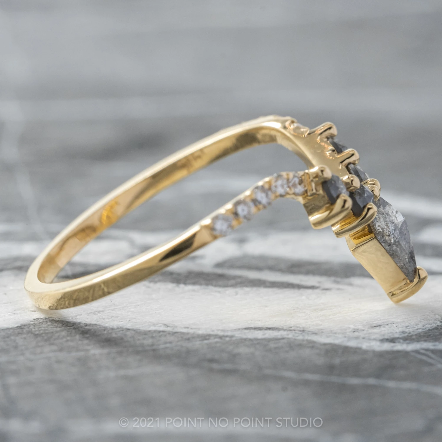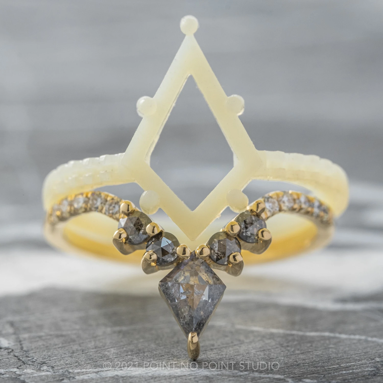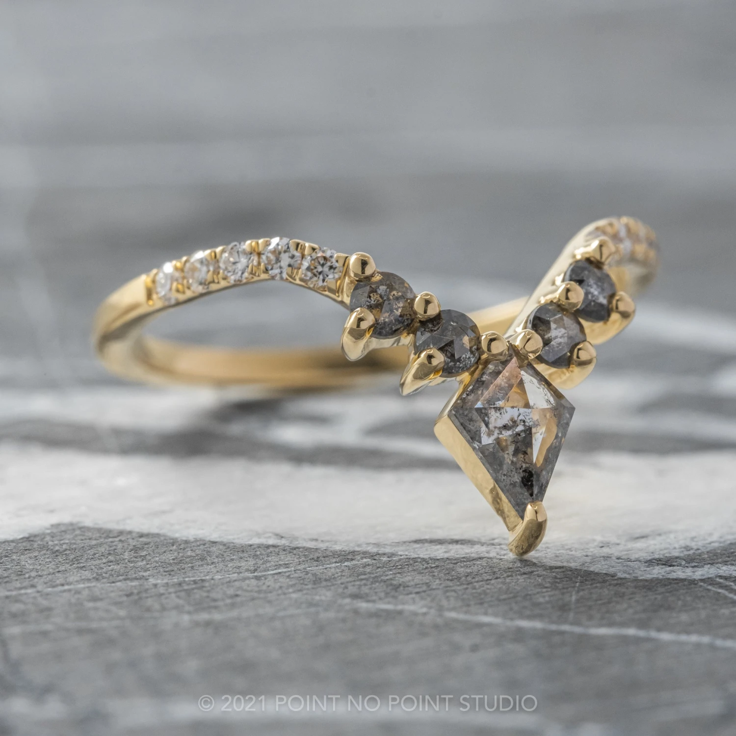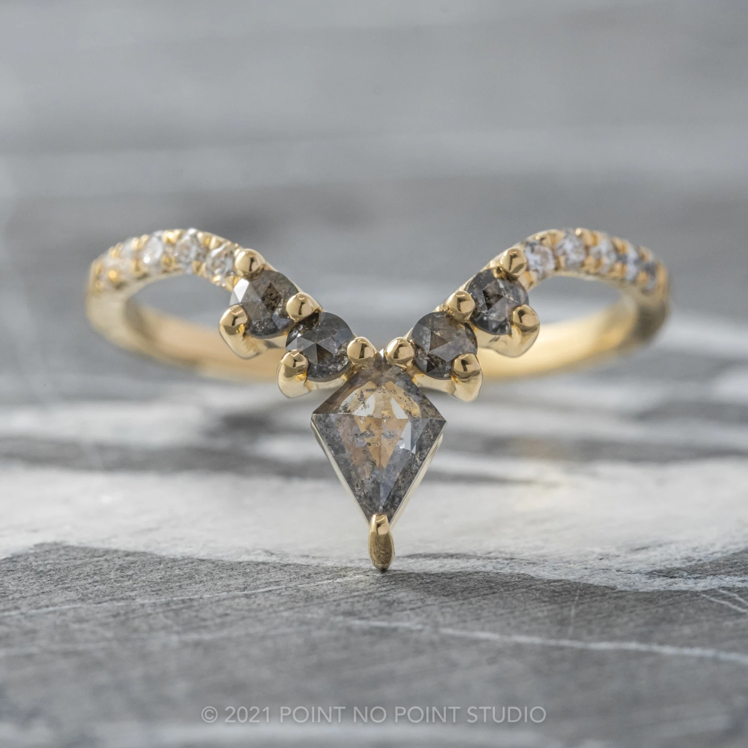 This timeless and unique wedding ring features striking natural kite diamond at the center of the V.  The kite diamond is accented by salt & pepper round rose cut diamonds.Â