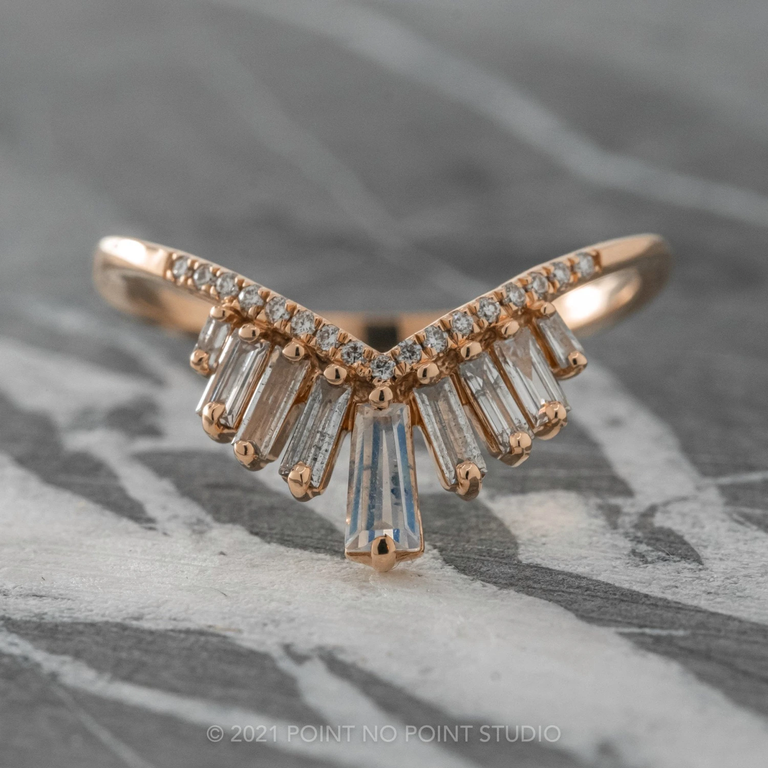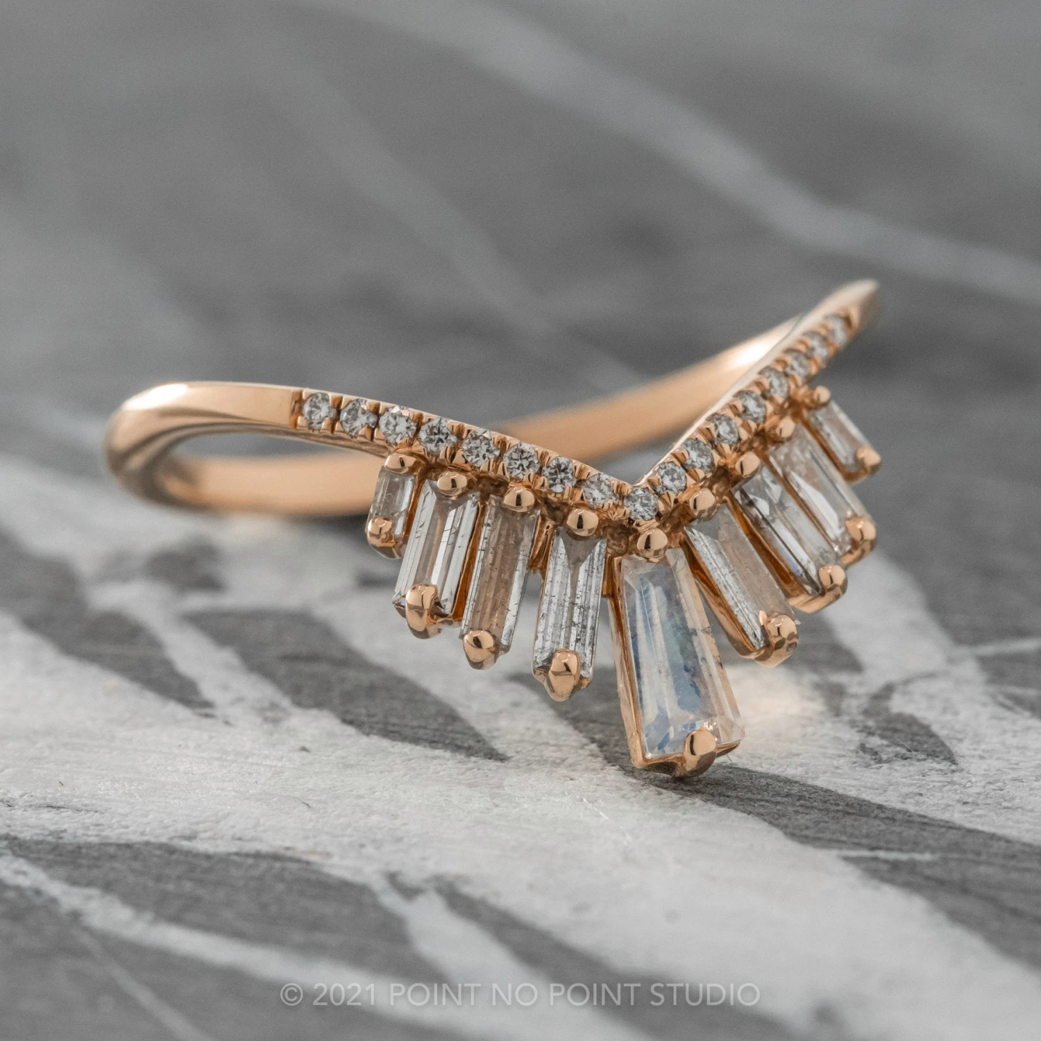This timeless and unique wedding ring features striking salt & pepper diamonds with a moonstone baguette set in the center. This unique hand crafted V shaped diamond band can be worn alone, stacked in multiples, or to match any number of engagement rings!