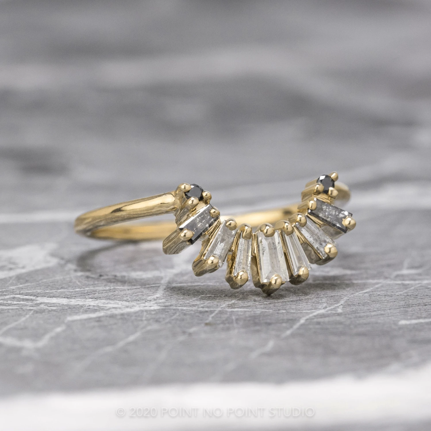 This timeless and unique wedding ring features salt & pepper baguettes accented with black diamonds in a softly contouring style that will complement many different engagement ring styles!Â