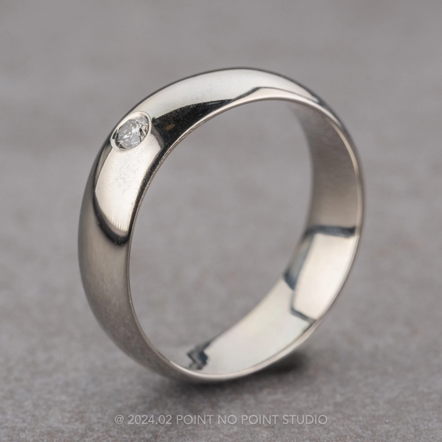 This ring is made of solid recycled eco friendly 14k recycled white gold. The band is so simple and traditional. The outside of the ring has been given a high polished finish. Set into the center of the band is a brilliant cut salt and pepper round diamond.Â
