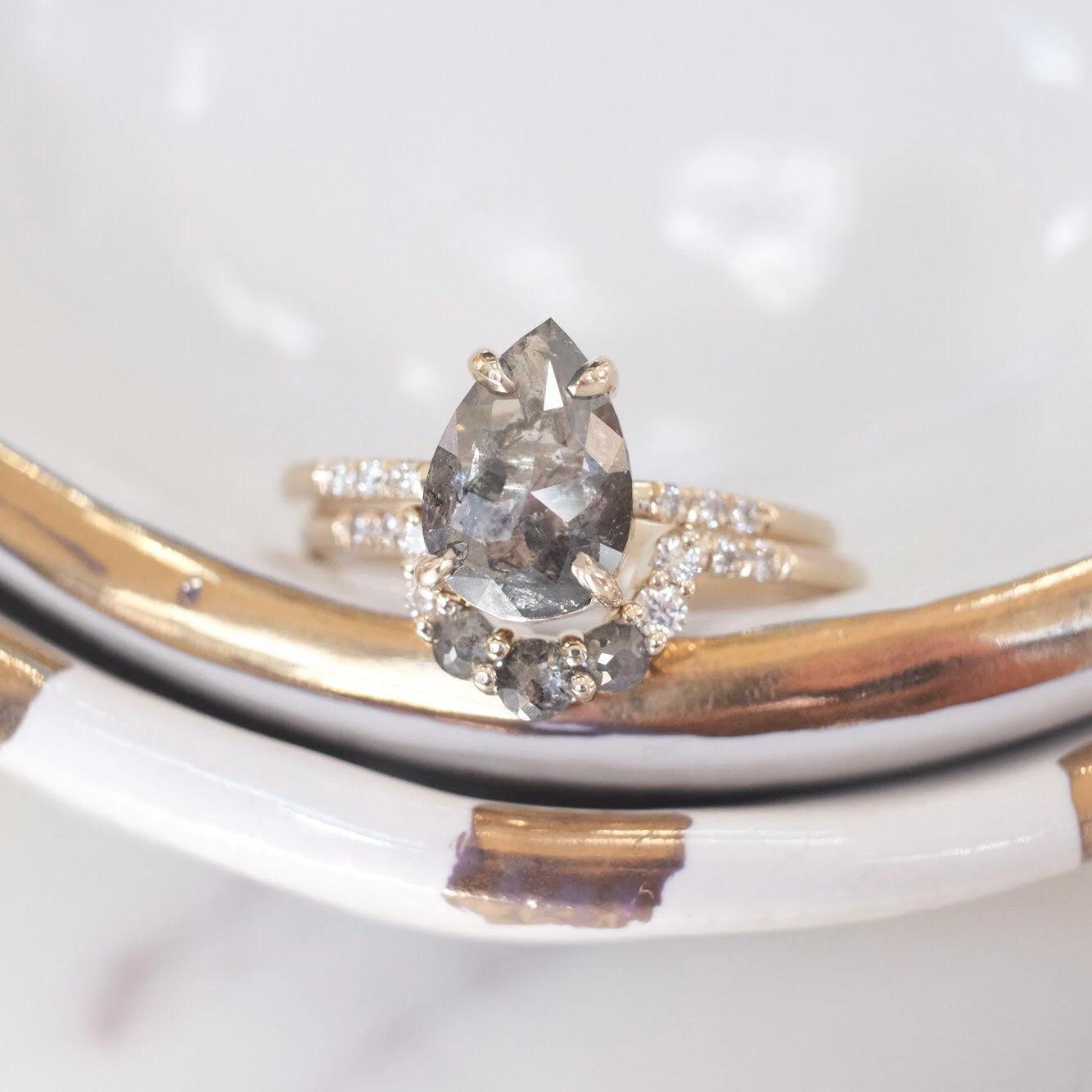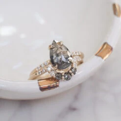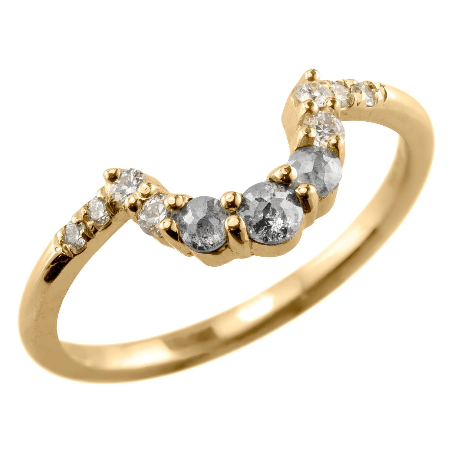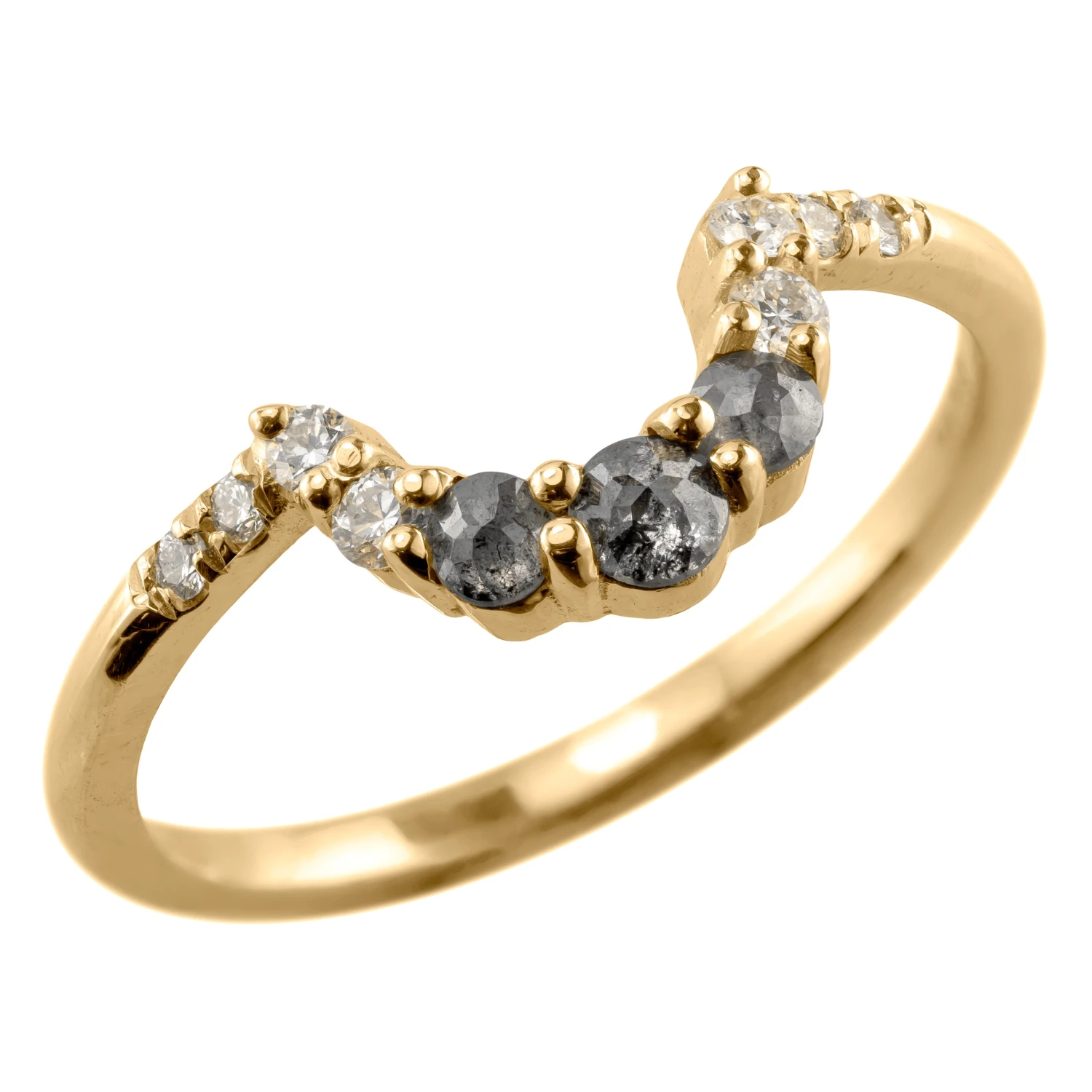 This timeless and unique salt and pepper diamond ring features striking a combination of salt and pepper with white diamonds. The ring features a soft diamond contoured curve, which will flatter many engagement ring stylesÂ