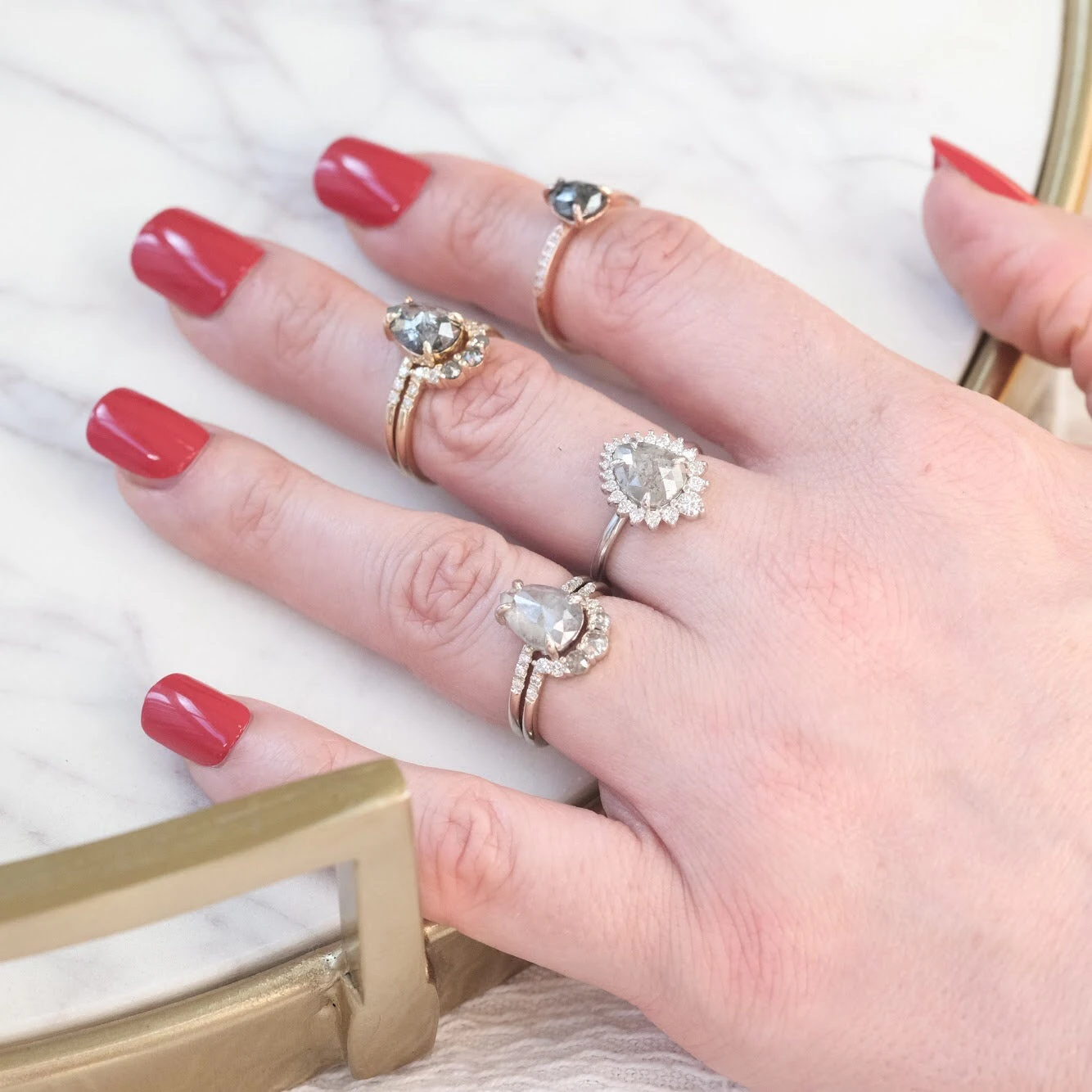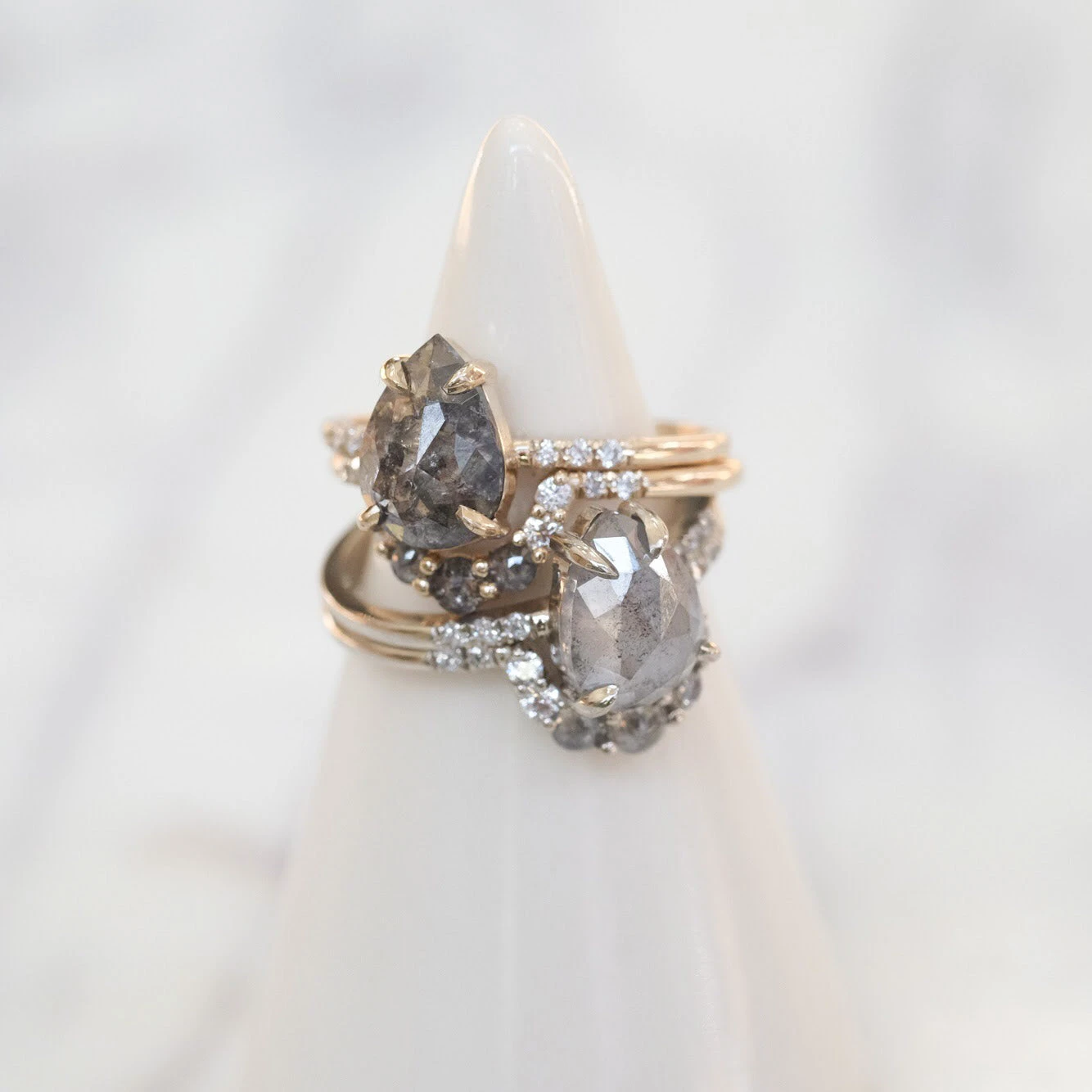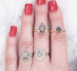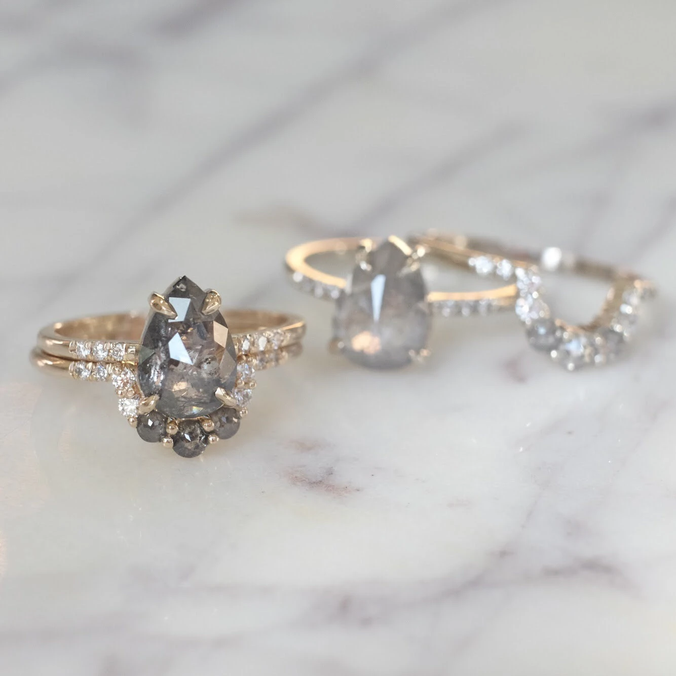 This timeless and unique salt and pepper diamond ring features striking a combination of salt and pepper with white diamonds. The ring features a soft diamond contoured curve, which will flatter many engagement ring stylesÂ