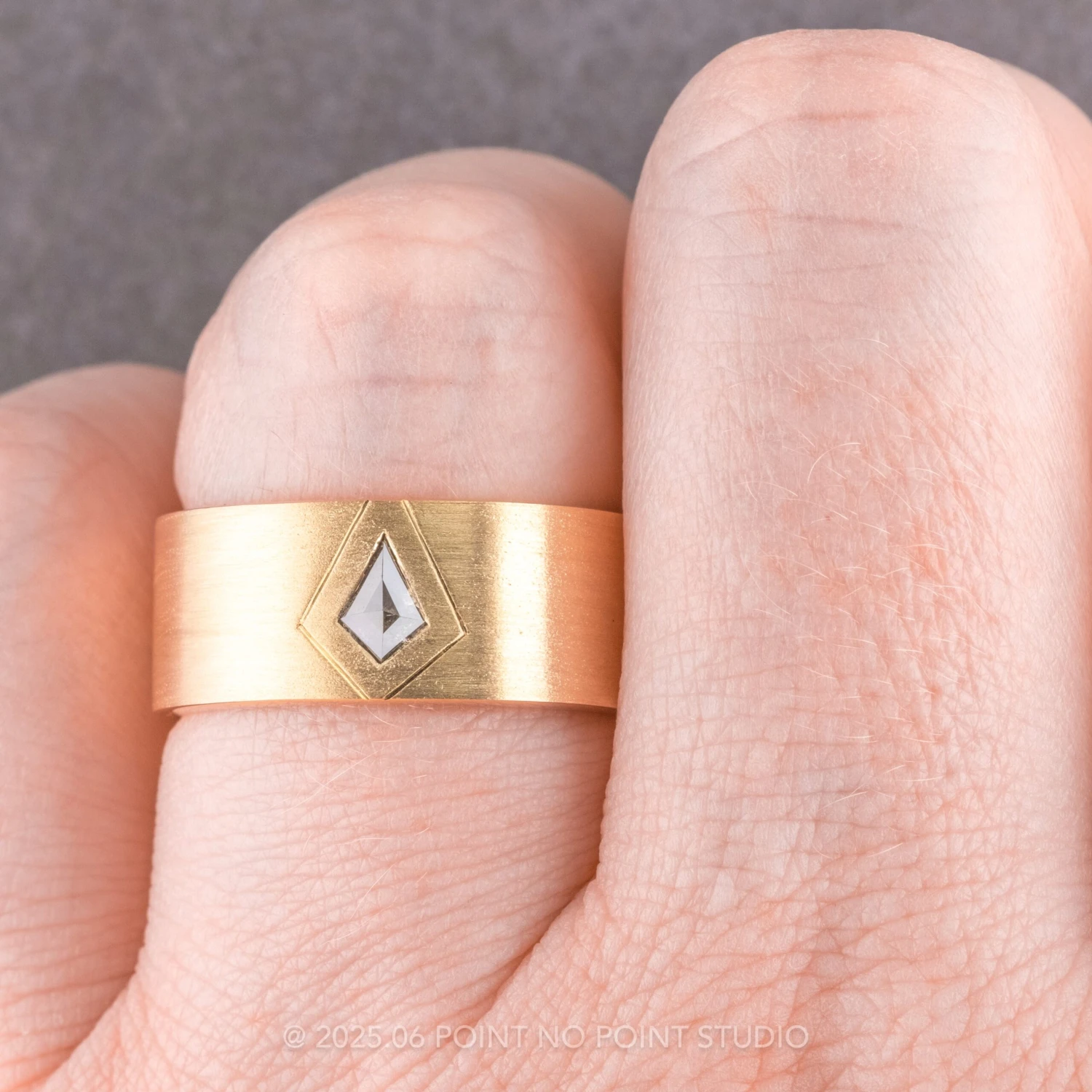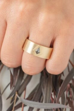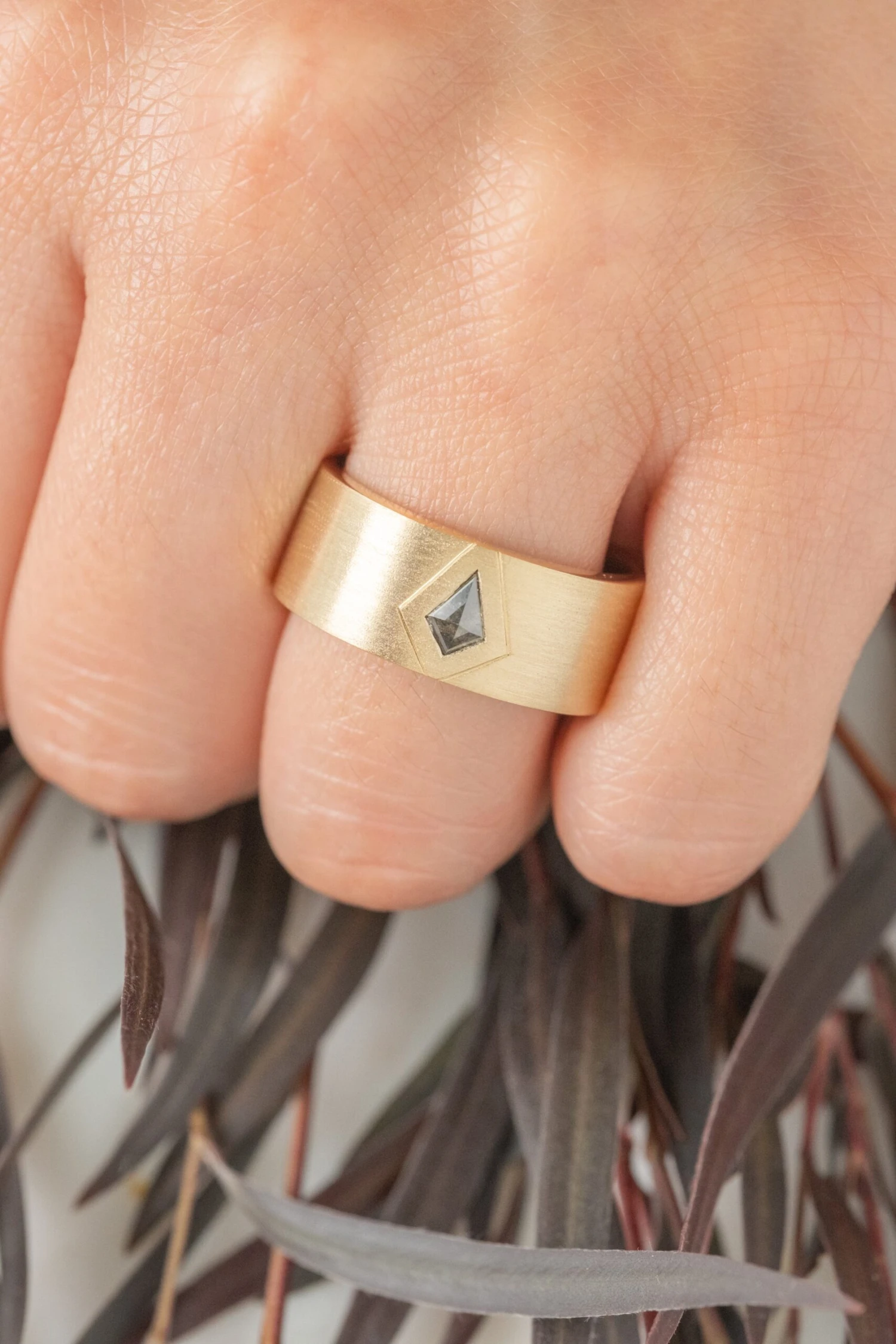This ring is made of solid recycled eco friendly 14k recycled yellow gold. The diamond band is so simple and traditional. Flush set into the center of the ring is a black speckled kite diamond. Around the diamond is a hand engraved kite shape. The ring is a standard fit and has a brushed matte finish.