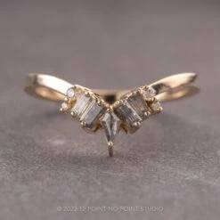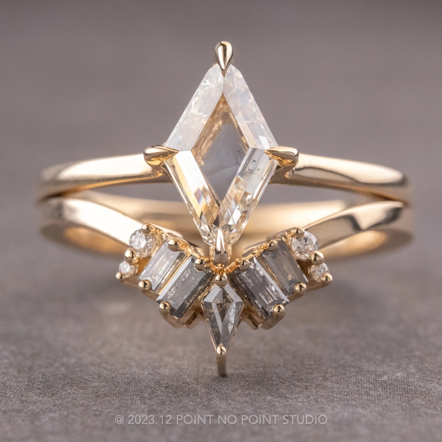 This timeless and unique wedding ring features sparkly GHSI white round accent diamonds and natural salt and pepper baguette diamonds with a striking salt and pepper kite diamond as the central focal point. The ring has a diamond v-contour, which will flatter many engagement styles.Â