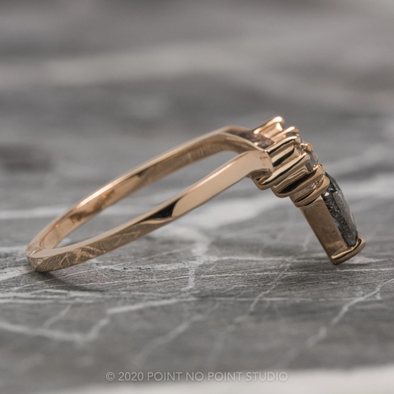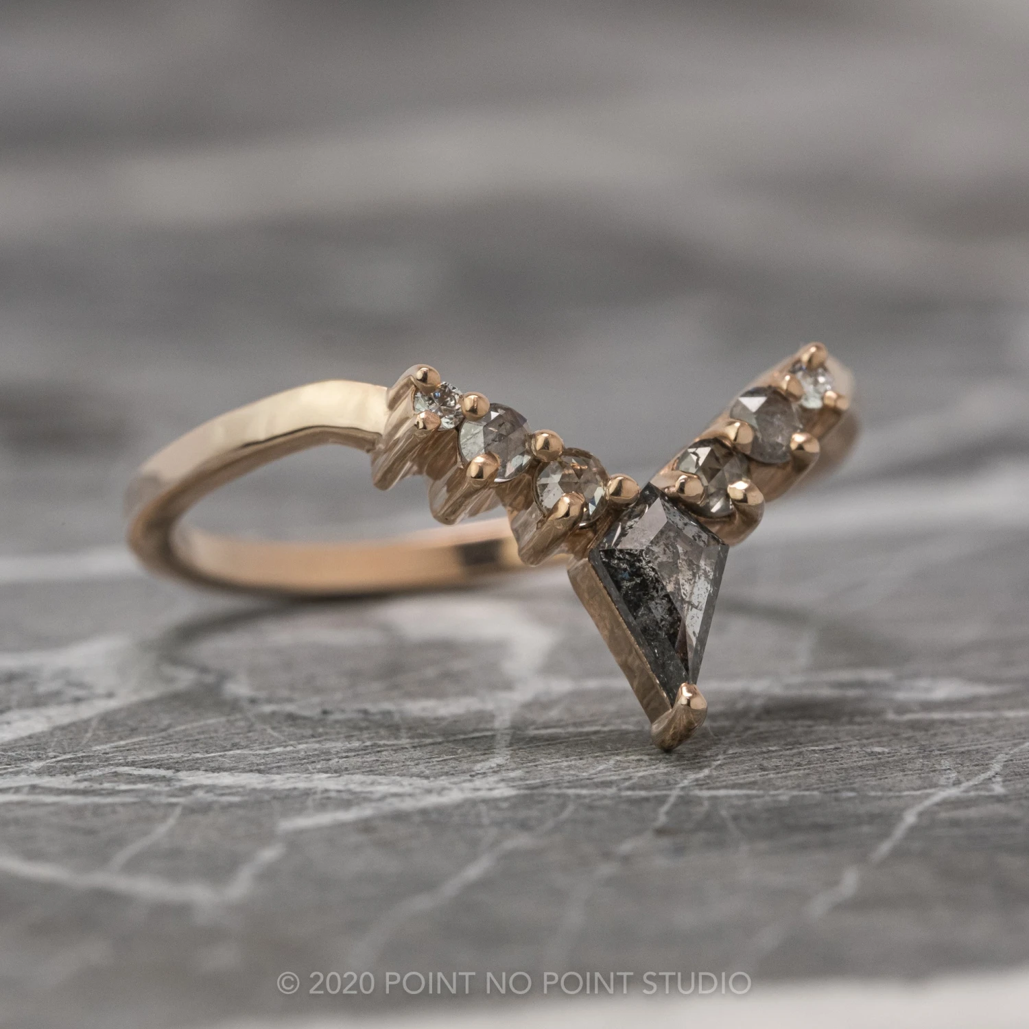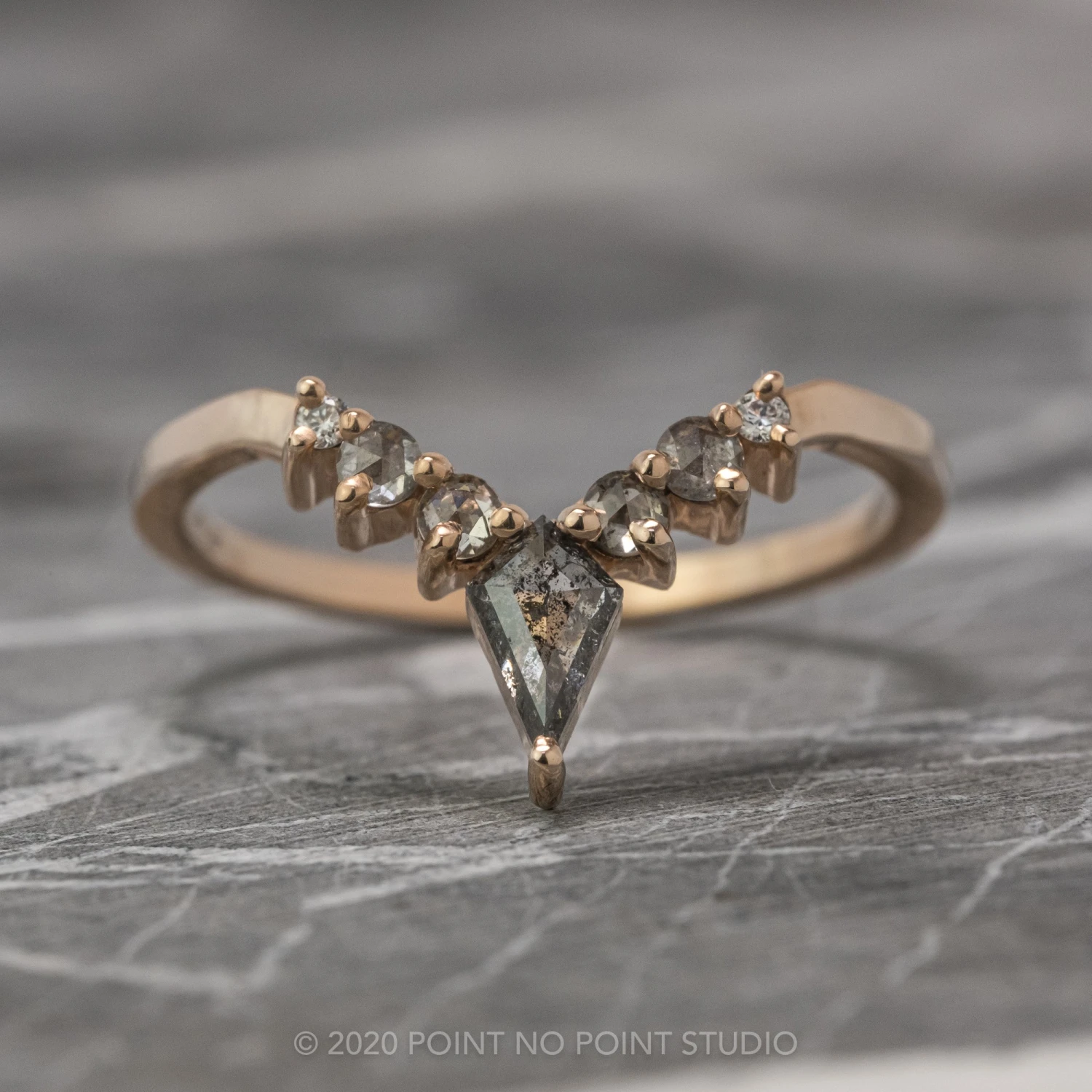 This timeless and unique wedding ring features a striking natural kite diamond at the center of the V.Ā Ā The kite diamond is accented by salt & pepper round rose cut diamonds.Ā Ā