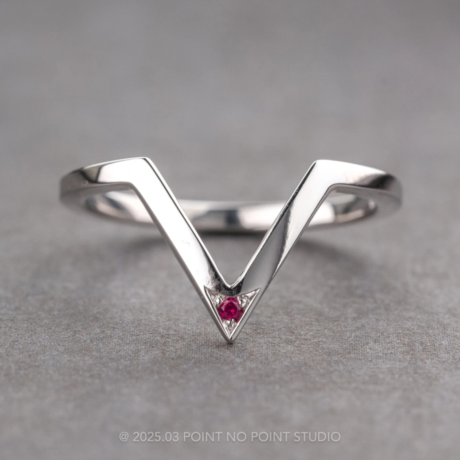 Set into the tip of the band is a .01 carat natural red ruby. The Platinum band measures 1.7mm and curves elegantly into a contoured V.