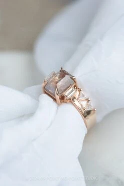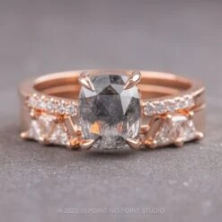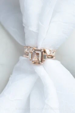 This unique cuff has 3 triangle diamonds prong set into the band on either side. The triangle diamonds are natural white GHSI diamonds. The cuff design was made with low-profile engagement rings in mind – the cuff satisfies the look of a straight across wedding ring that typically is not able to slide under a low-profile setting. The entire ring is made of eco-friendly recycled 14k rose gold.Â
