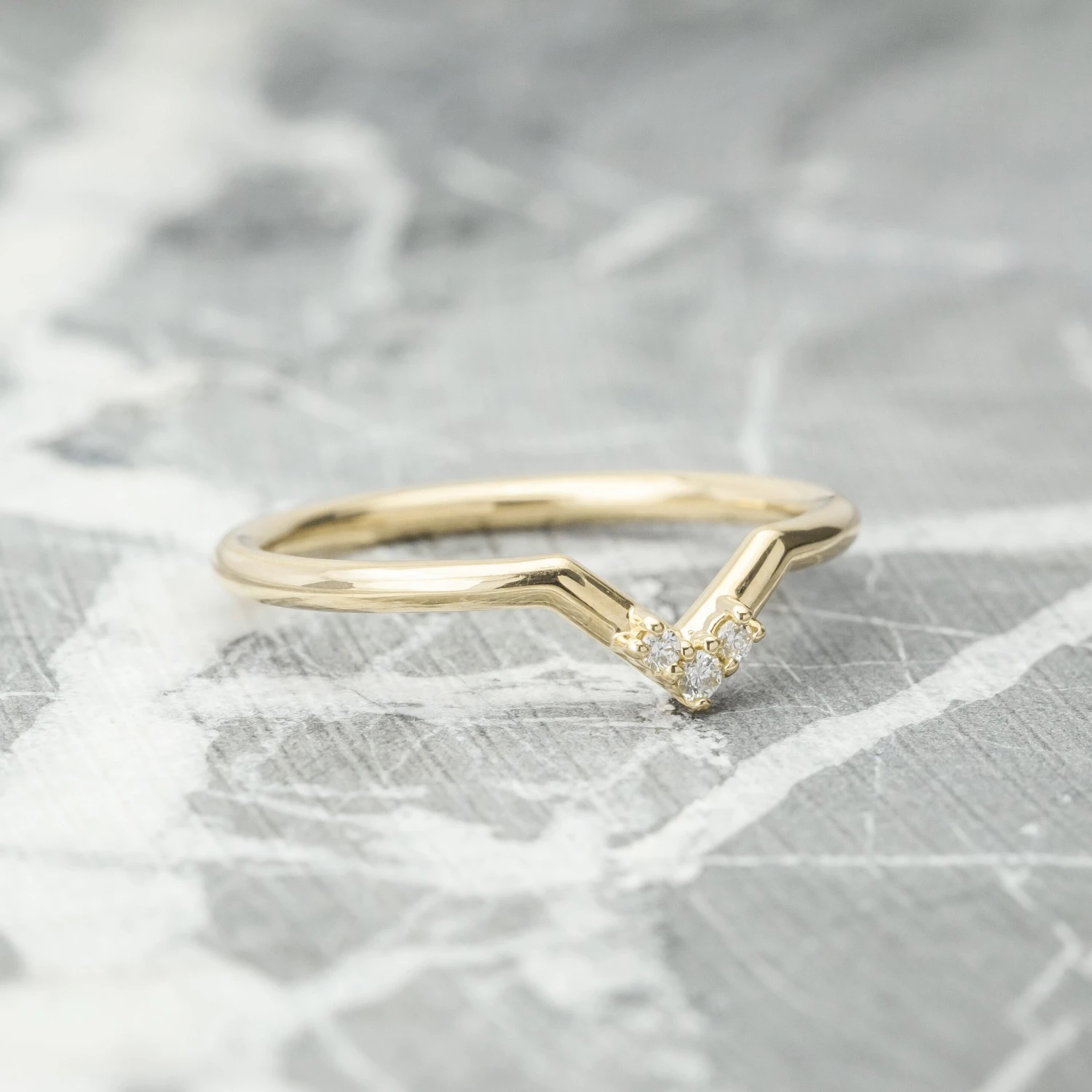 A simple hand crafted V shaped wedding band to be worn alone, stacked in multiples, or to match any number of engagement rings! The band measures 1.7mm and curves elegantly into a contoured V with 3 diamonds prong set onto the V tip.Â