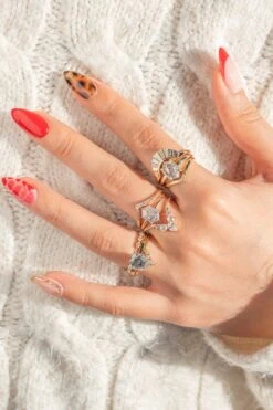 The entire Vivian ring is made of 14k yellow gold with a polished finish and milgrain detailing around the diamonds; the settings for the stones were made to be low profile and comfortable for everyday wear. Â