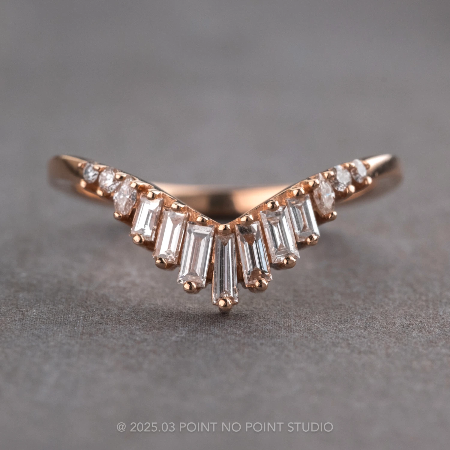 This timeless and unique wedding ring features striking white baguette diamonds accented by natural GHSI marquise and round diamonds in a softly contouring style that will complement many different engagement ring styles!Ā