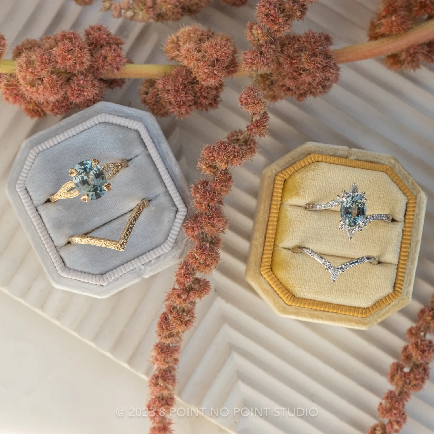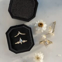 This velvet box has a gorgeous small octagonal shape, with 2 ring slots to showcase 2 rings – perfect to show a stacked engagement ring/wedding band set!Â