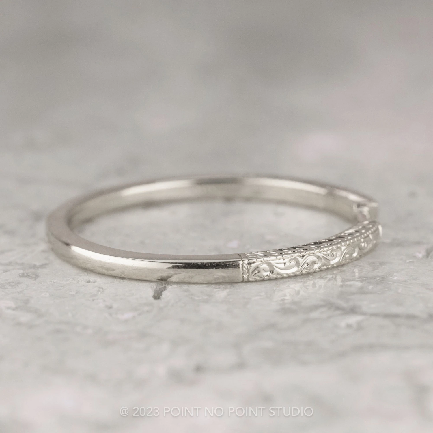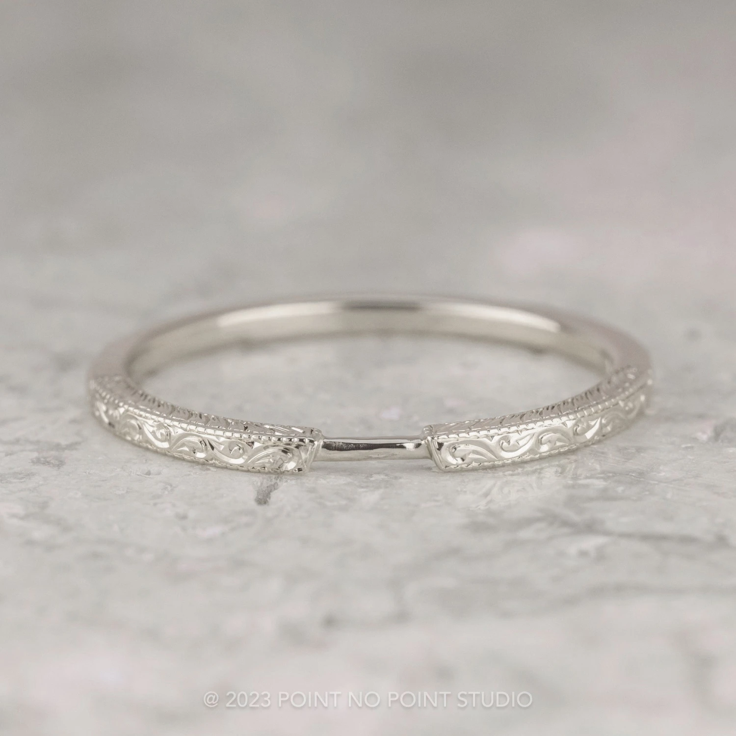 An elegantly enhanced version of our classic Harper cuff with hand engraved ornate detailing features a versatile open cuff design that will complement almost any engagement ring! The cuff design was made with low-profile engagement rings in mind – the cuff satisfies the look of a straight across wedding ring that typically is not able to slide under a low-profile setting.
