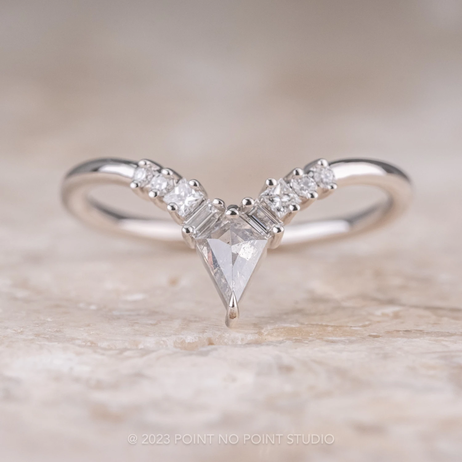 A simple hand crafted v shaped wedding band to be worn alone, stacked in multiples, or to match any number of engagement rings! The V contour is formed by .32 cts of white diamonds. Set into the middle of the V is a beautiful kite rose cut diamond accented by brilliant cut round and baguette diamonds.Â