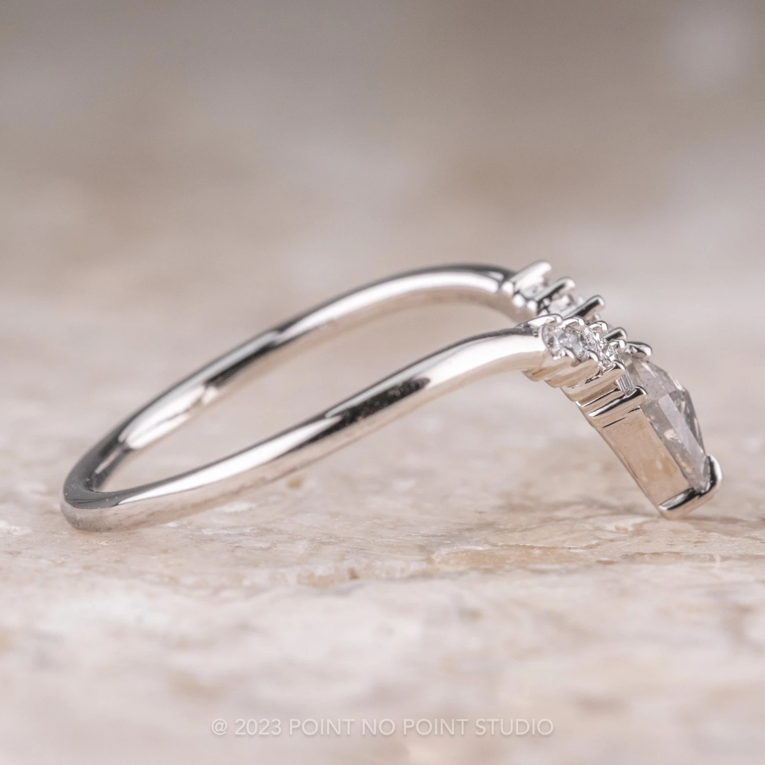 A simple hand crafted v shaped wedding band to be worn alone, stacked in multiples, or to match any number of engagement rings! The V contour is formed by .32 cts of white diamonds. Set into the middle of the V is a beautiful kite rose cut diamond accented by brilliant cut round and baguette diamonds.Â