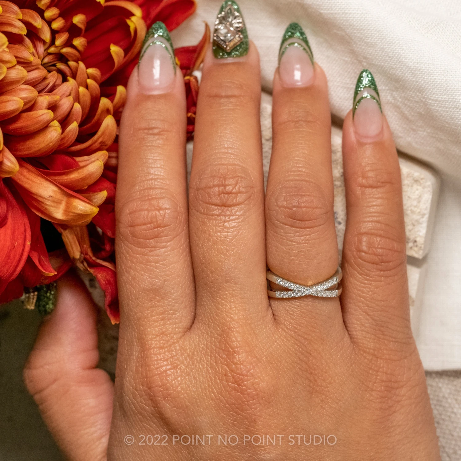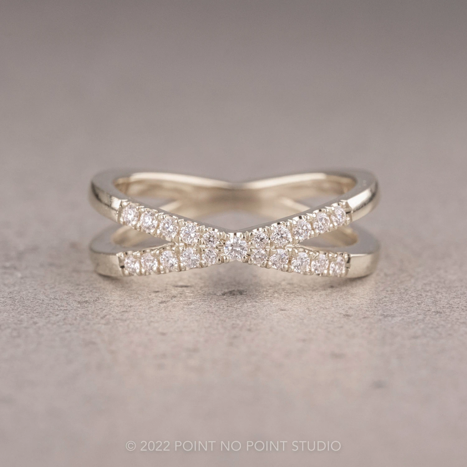 This knockout ring features an X style band that is dripping in diamonds. The X style contours with many different engagement rings that have settings that bump out from the band, or it is also low profile enough that it stacks with many different rings.