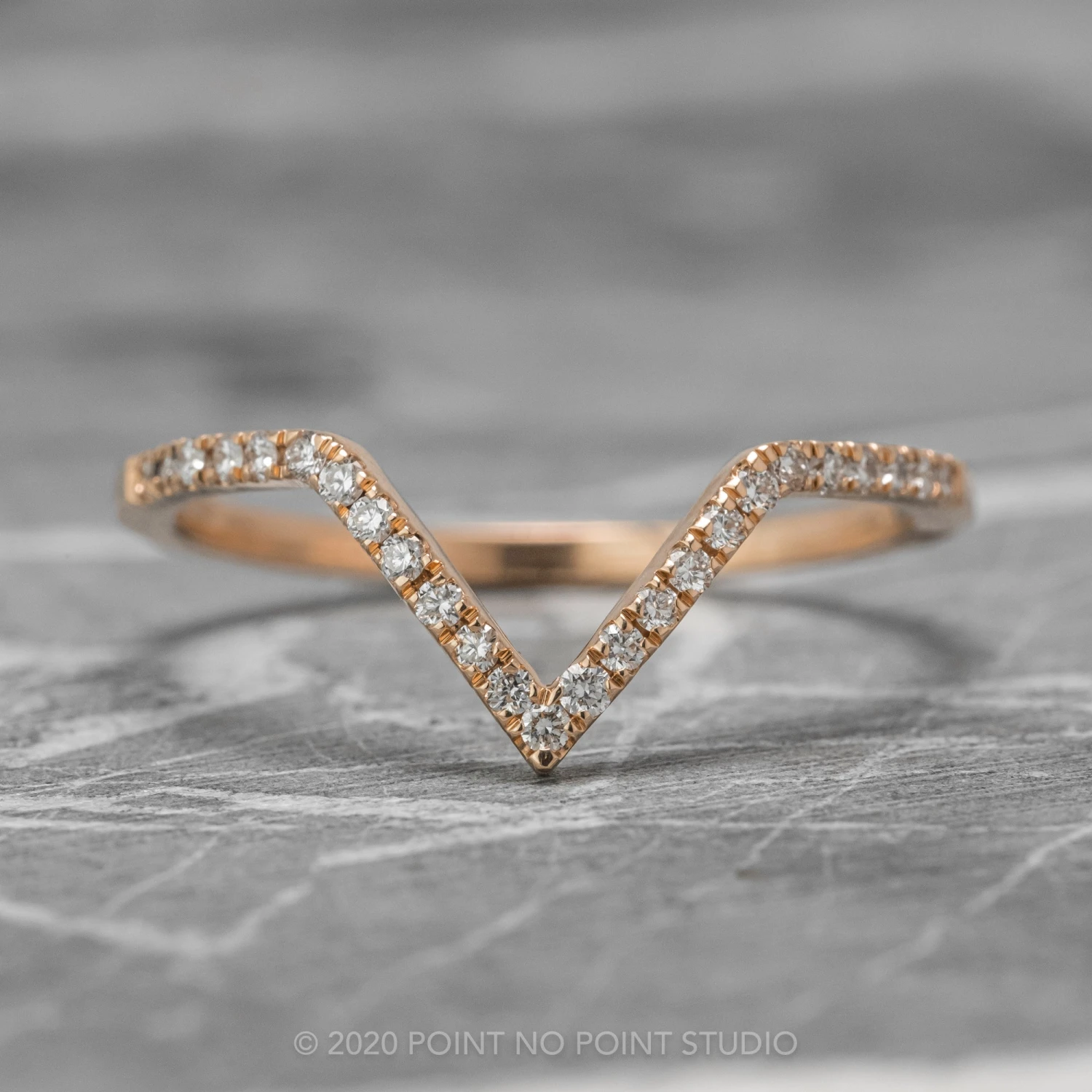 Enhance your engagement ring with the beautiful 14k rose gold chevron wedding band. The versatile profile matches up with many different ring styles. Pictures include a few different options of contouring styles.   Â